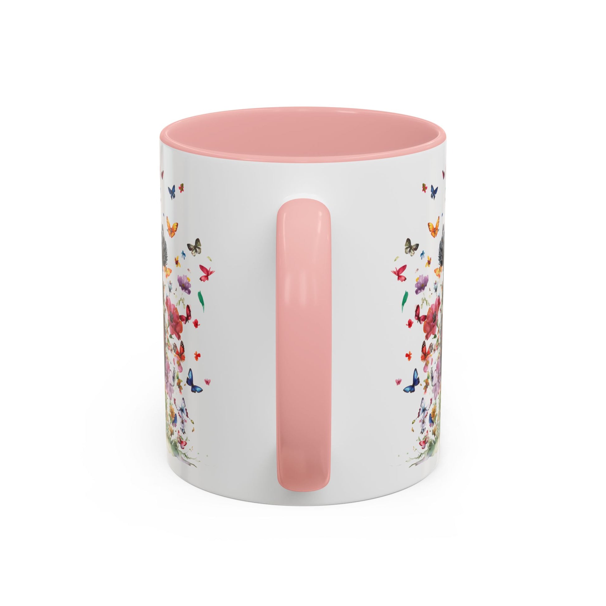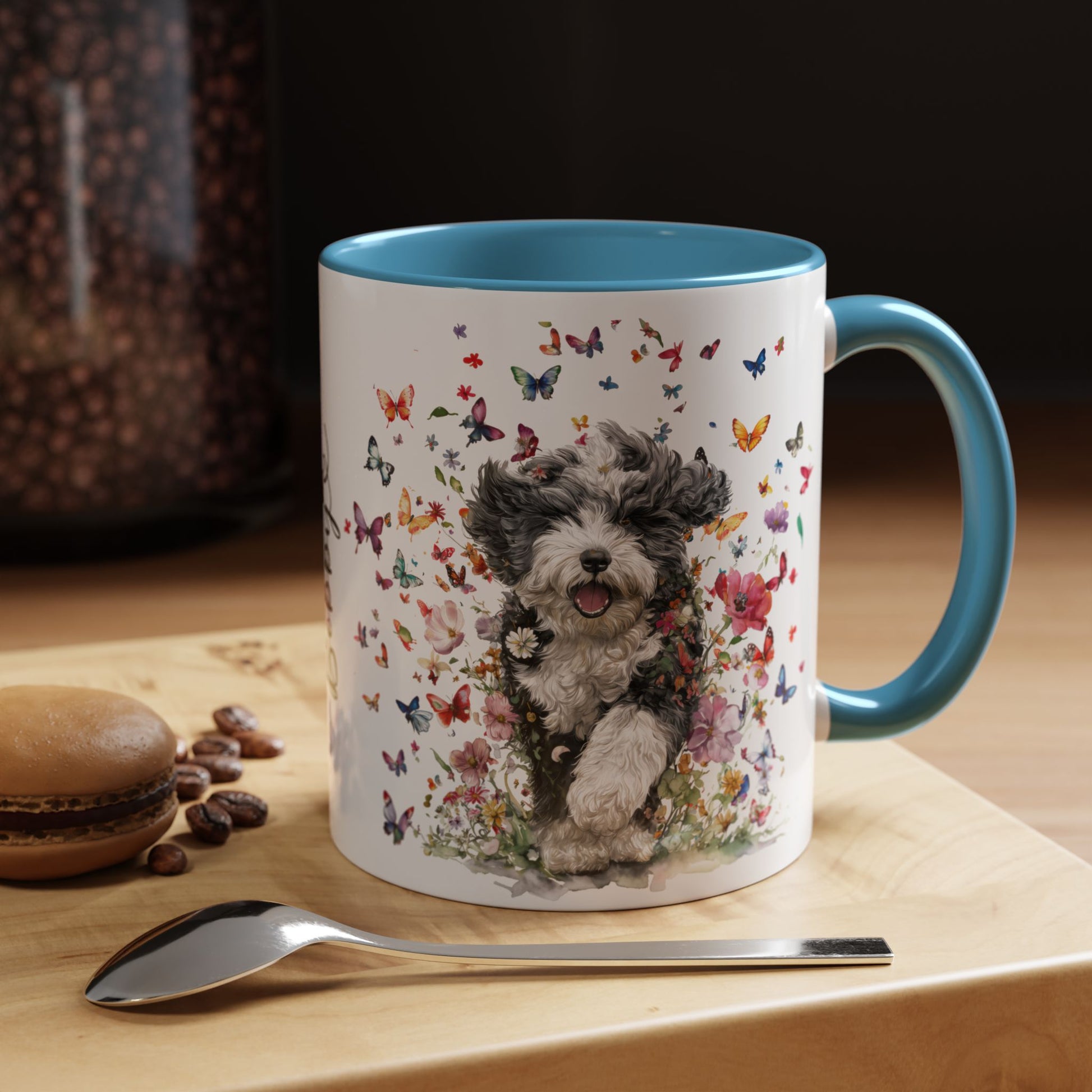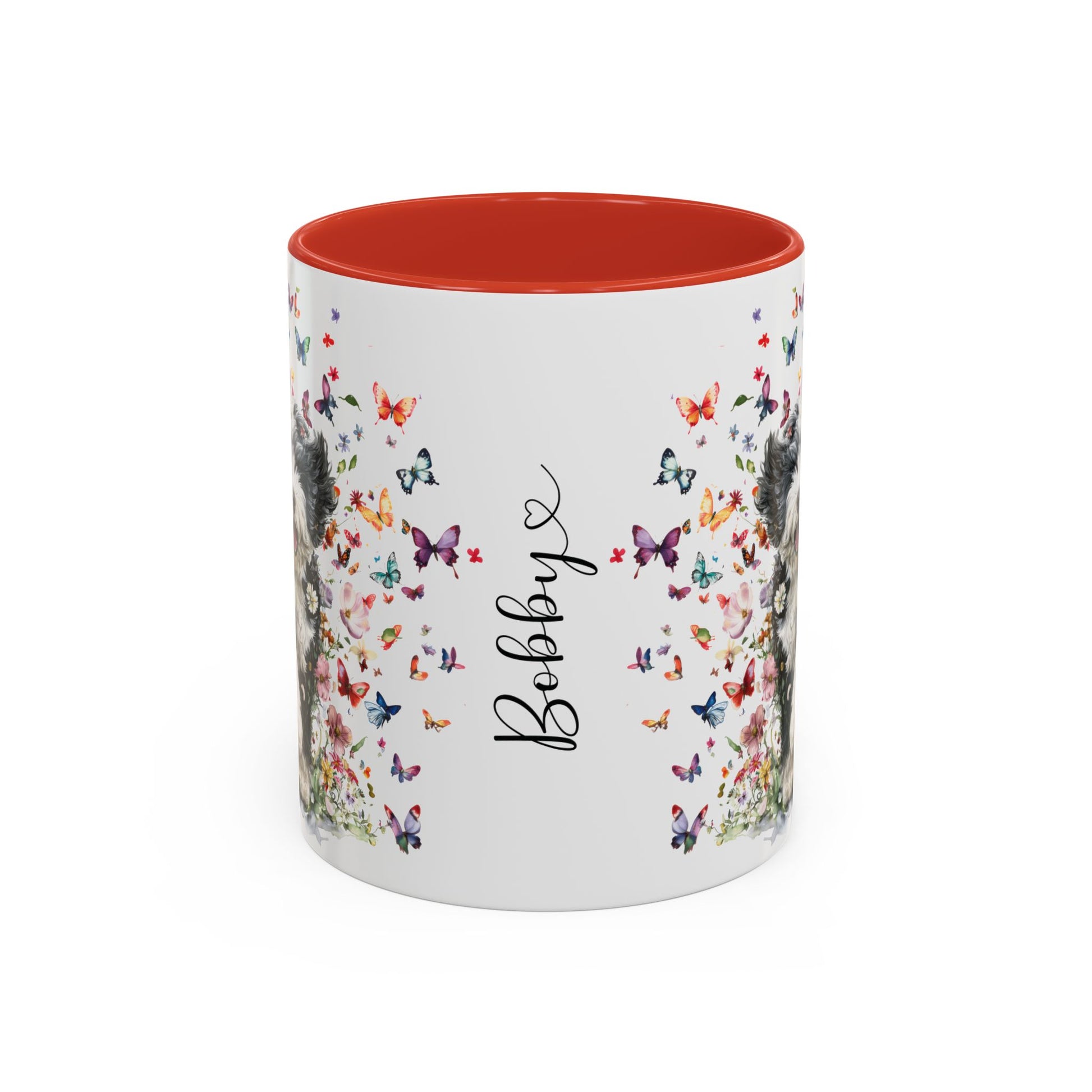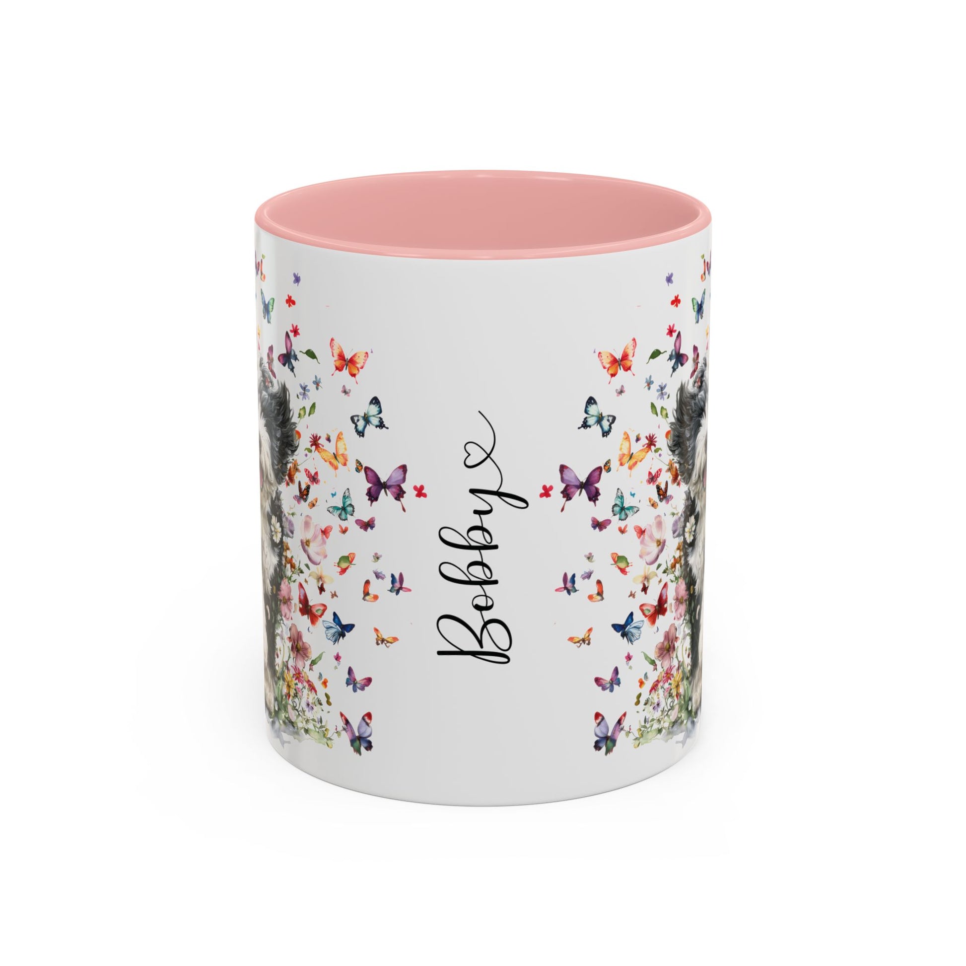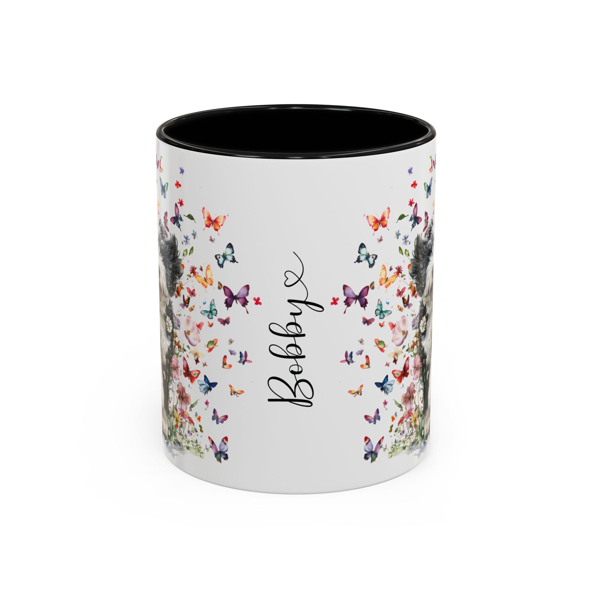 Personalised Bernedoodle butterfly ceramic coffee mug, 11oz. Customise with either your name or your Bernedoodle's name.
