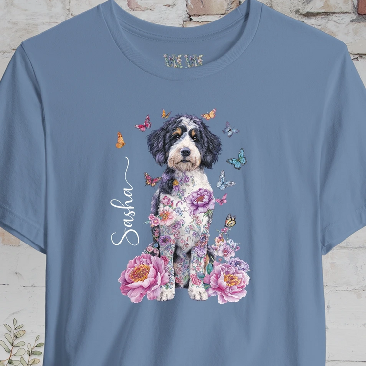 🦋 Celebrate your love for your Bernedoodle with our Personalized Bernedoodle T-shirt, featuring beautiful Peonys & delicate butterflies. This custom gift is perfect for any Bernedoodle lover or owner, offering a floral custom shirt that's as unique as their bond with their furry friend. Add your fur baby's name for that special touch, or give as a perfect gift to a loved one.