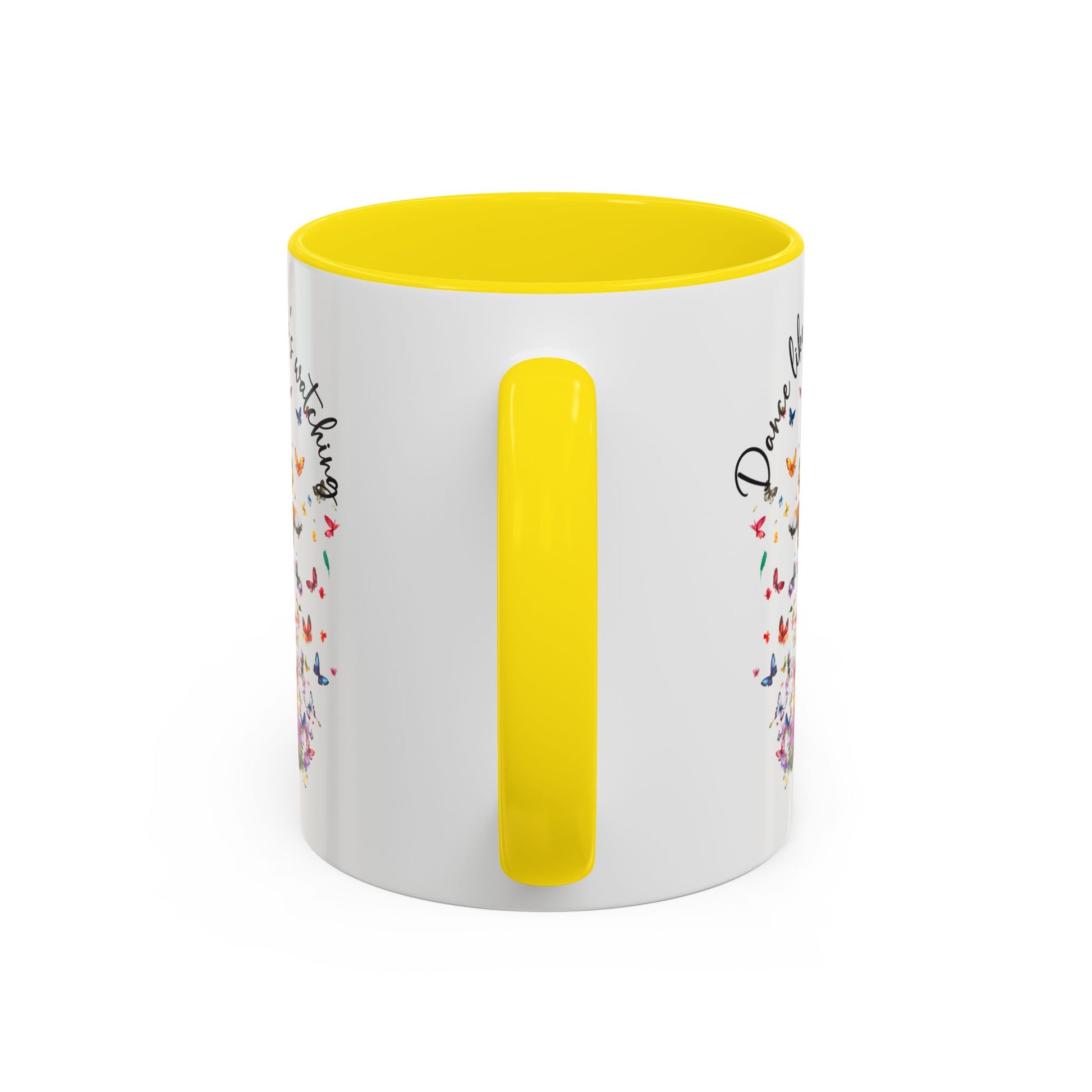 Whimsical dog mug featuring a joyful Bernese Mountain Dog surrounded by colorful butterflies and flowers. Inspirational quote ‘Dance like nobody’s watching’ makes it a perfect gift for dog lovers, coffee lovers, and anyone who enjoys uplifting cottagecore style.