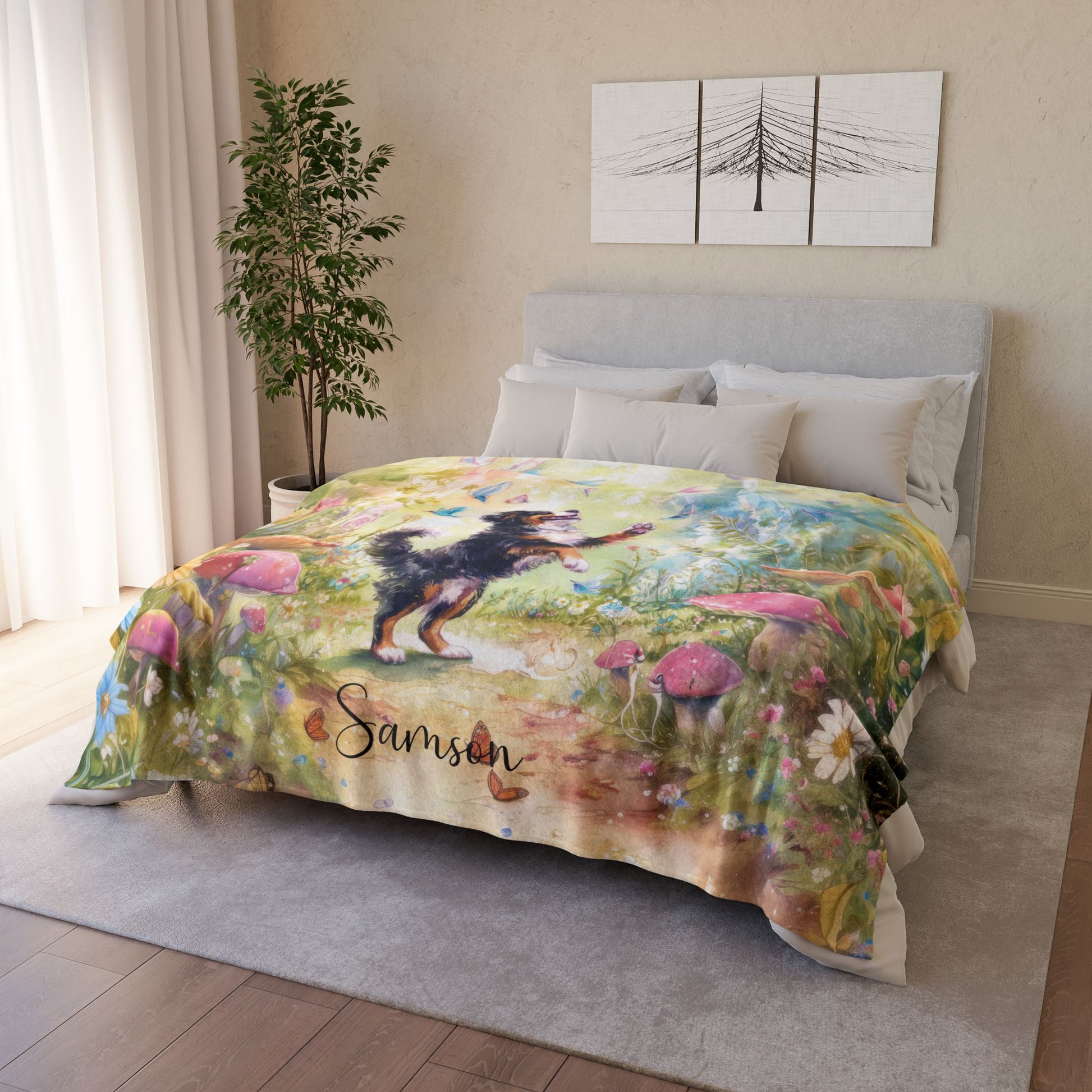 🦋 Celebrate your love for your Bernese Mountain Dog with our personalized dancing Bernese blanket, featuring your favorite furry friend dancing in our colorful mystical forest. This custom gift is perfect for any Bernese Mountain Dog lover or owner, offering a unique, coay blanket that's as unique as their bond with their furry friend. Add your fur baby's name for that special touch, or give as a perfect gift to a loved one.