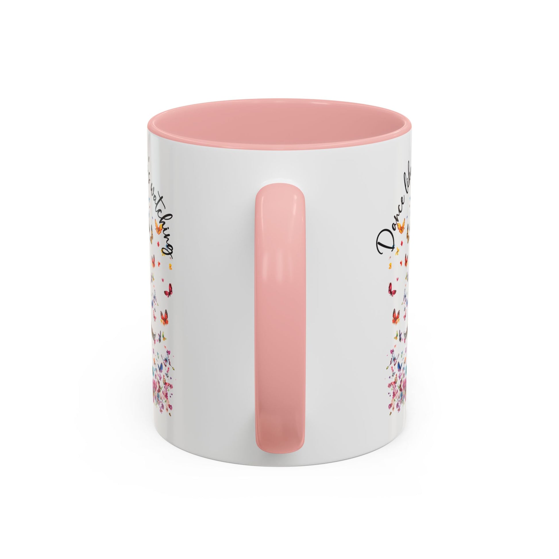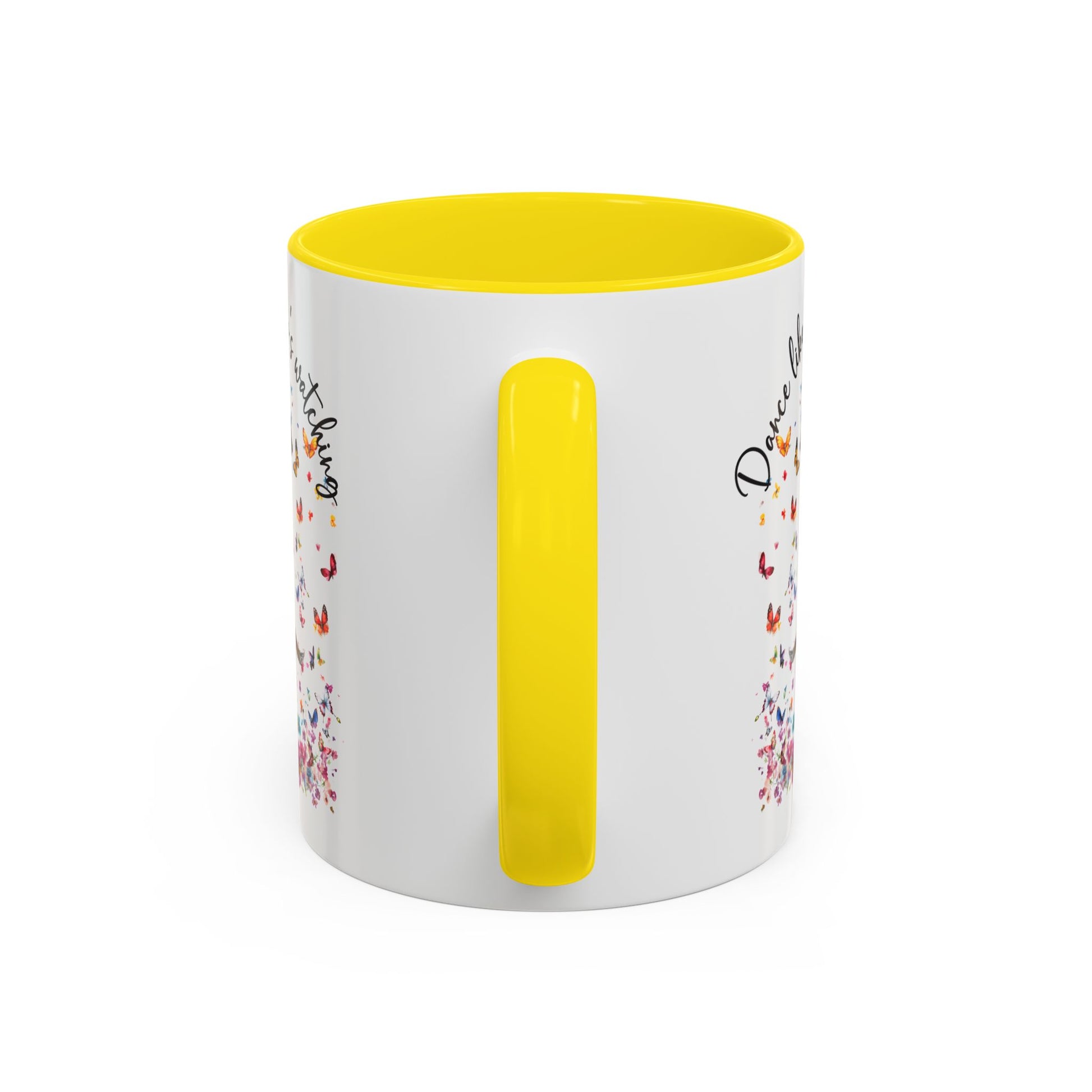 Whimsical dog mug featuring a joyful Border Terrier surrounded by colorful butterflies and flowers. Inspirational quote ‘Dance like nobody’s watching’ makes it a perfect gift for dog lovers, coffee lovers, and anyone who enjoys uplifting cottagecore style.