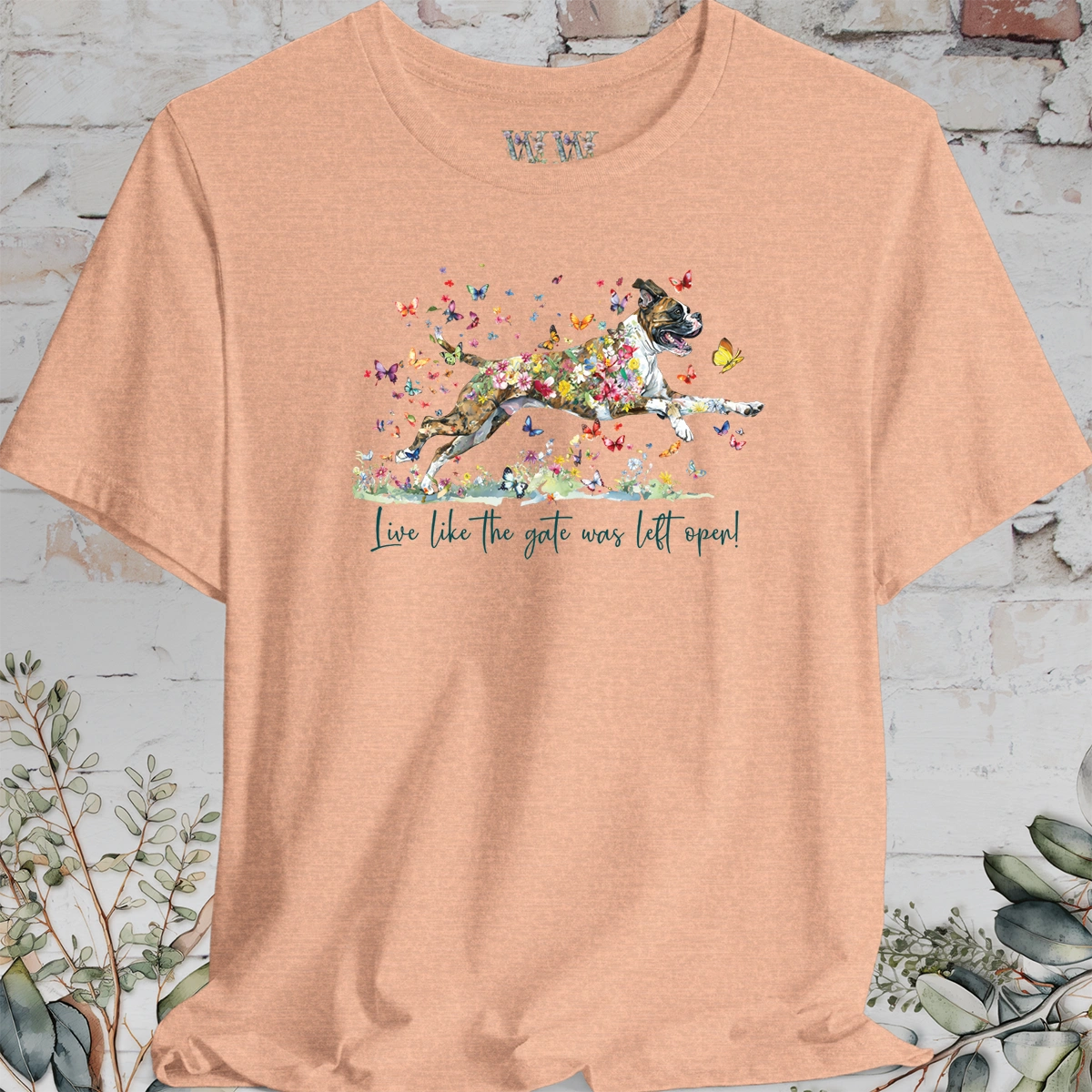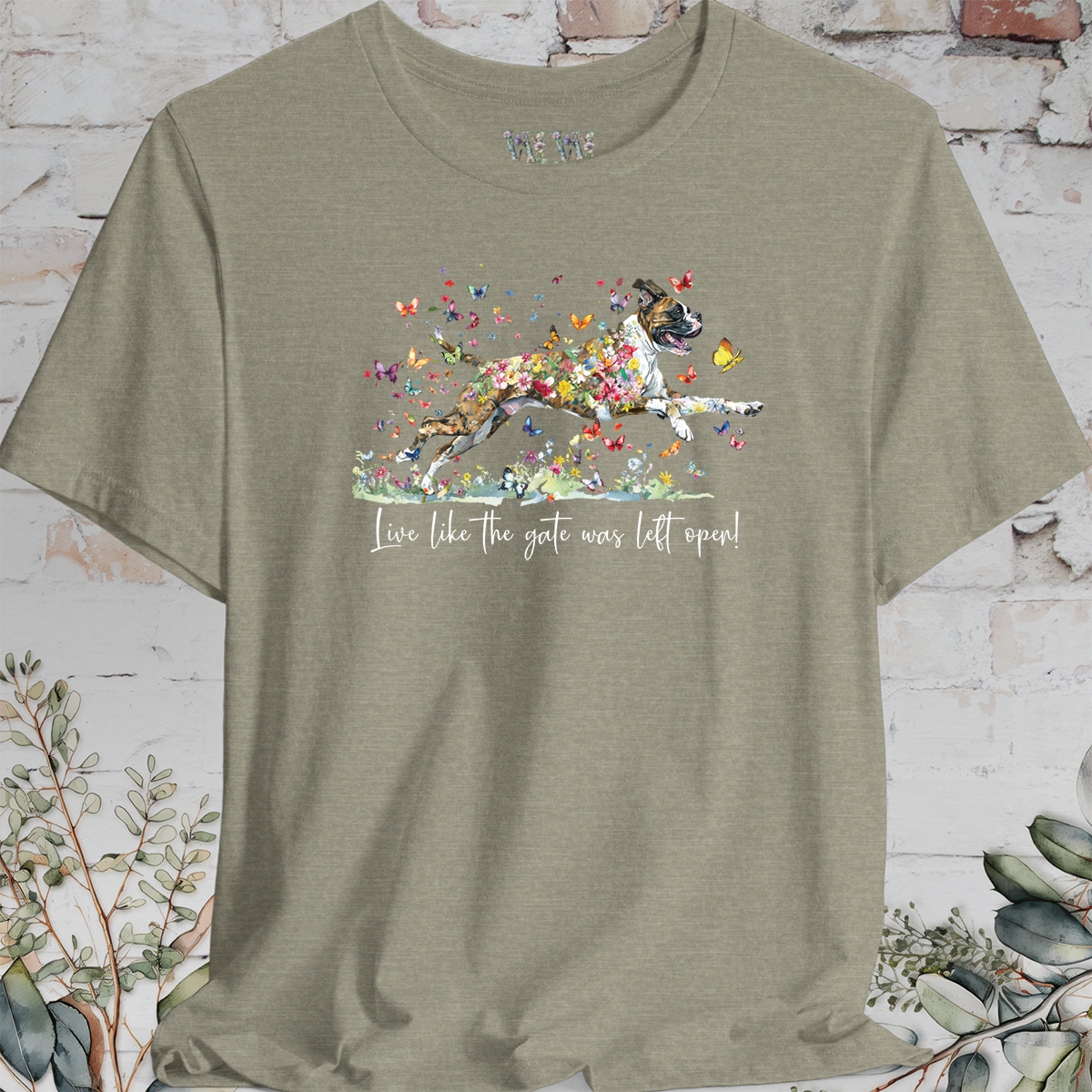 🦋 Celebrate the boundless joy of your furry friend with this vibrant Boxer T-shirt! 🌈 Featuring a colorful Boxer surrounded by butterflies and the inspiring words, "Live like the gate was left open!", this unisex tee is perfect for dog lovers who cherish the adventurous spirit of their pups. 🐾