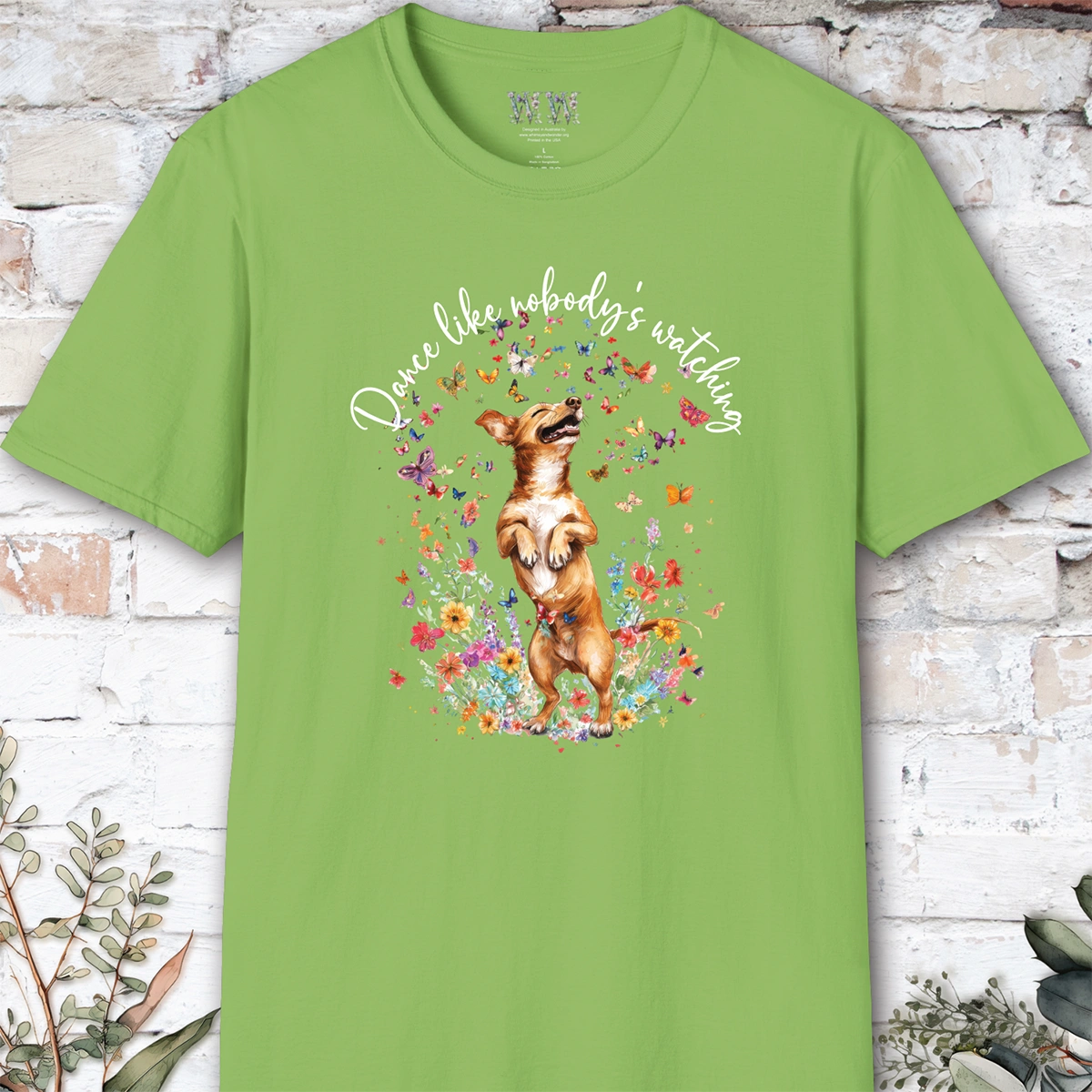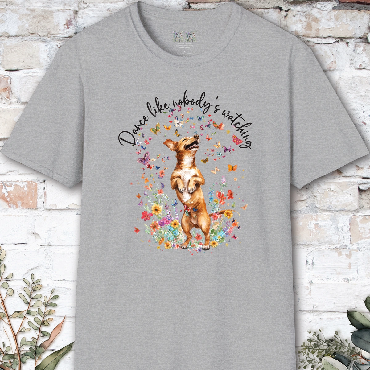 Let your spirit shine with this joyful Chiweenie tee from Whimsy and Wonder. Featuring a playful floral dog dancing among a flurry of butterflies and the phrase “Dance like nobody’s watching,” this design is pure happiness for dog lovers and free spirits alike.