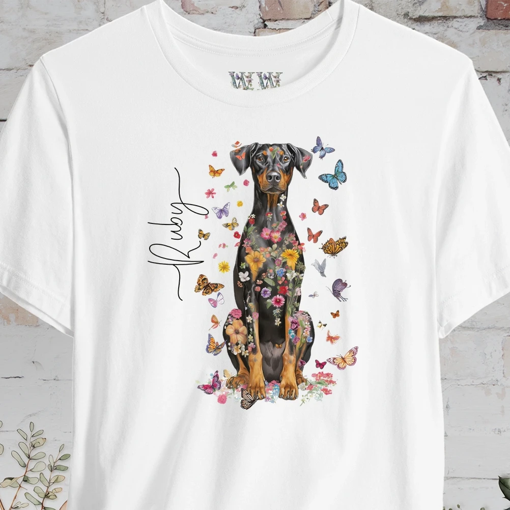 🦋 Celebrate your love for your Doberman Pinscher with our Personalized T-shirt, featuring a colorful floral design. This custom gift is perfect for any Doberman lover or owner, offering a floral custom shirt that's as unique as their bond with their furry friend. Add your fur baby's name for that special touch, or give as a perfect gift to a loved one.