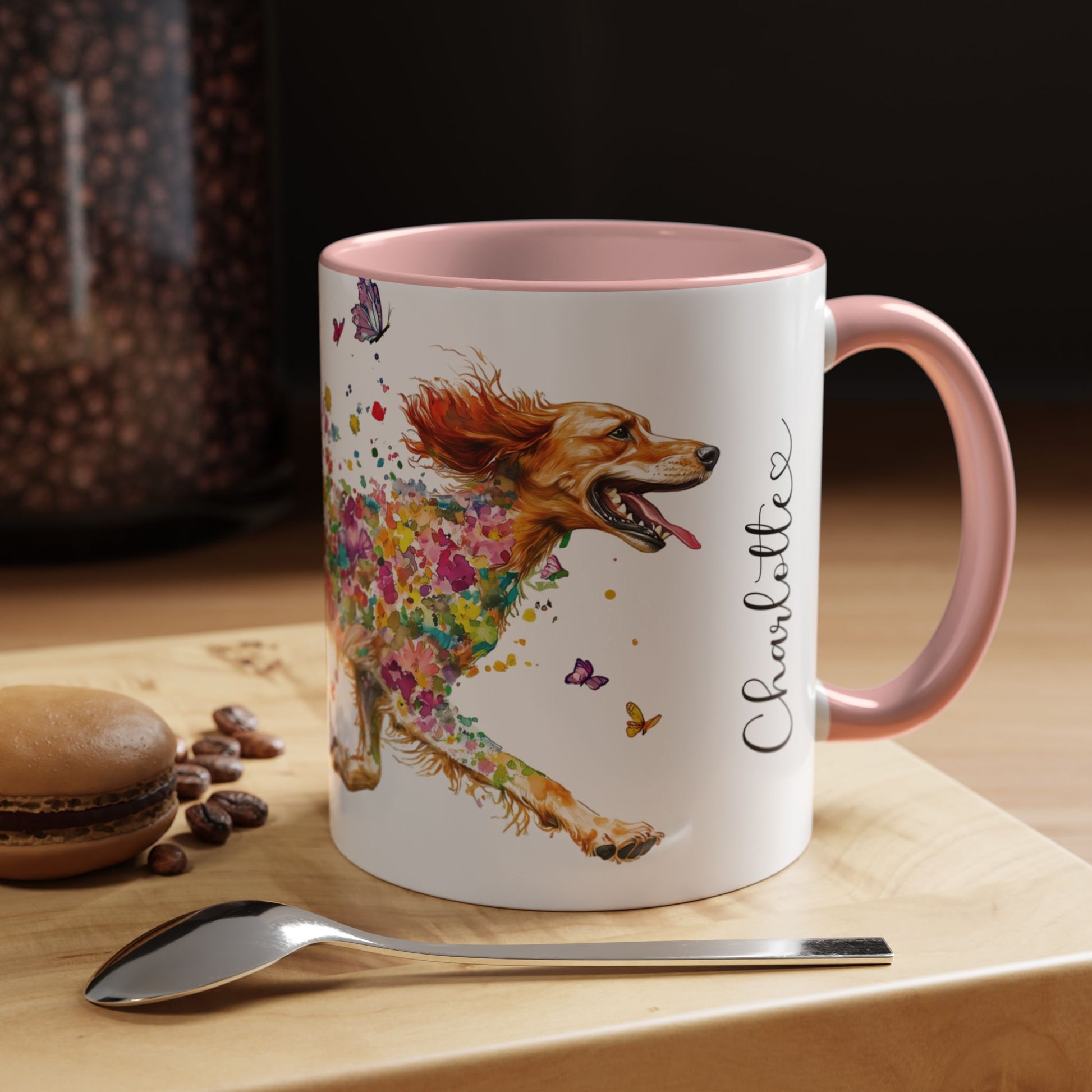 Personalised English Setter butterfly ceramic coffee mug, 11oz. Customise with either your name or your English Setter's name.