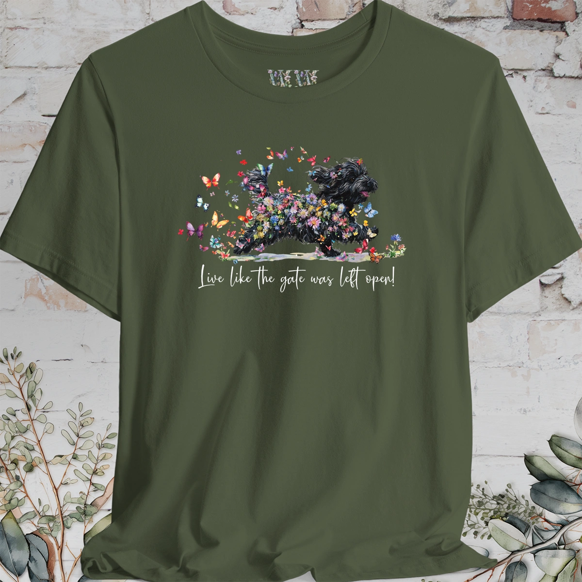 🦋 Celebrate the boundless joy of your furry friend with this vibrant Havanese T-shirt! 🌈 Featuring a colorful Havanese surrounded by butterflies and the inspiring words, "Live like the gate was left open!", this unisex tee is perfect for dog lovers who cherish the adventurous spirit of their pups. 🐾
