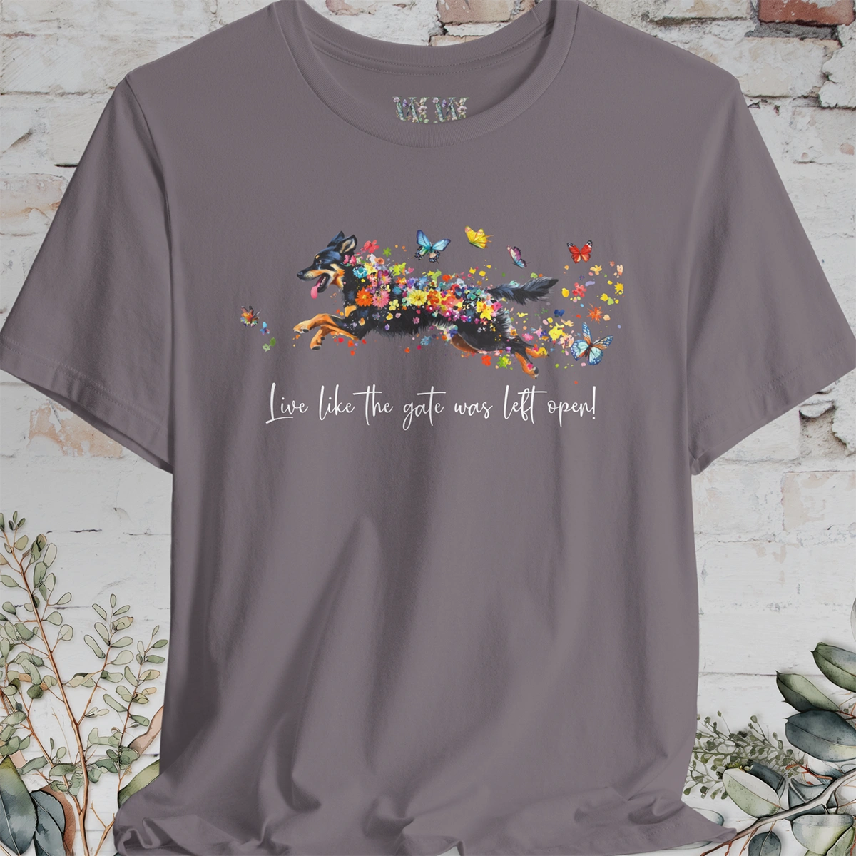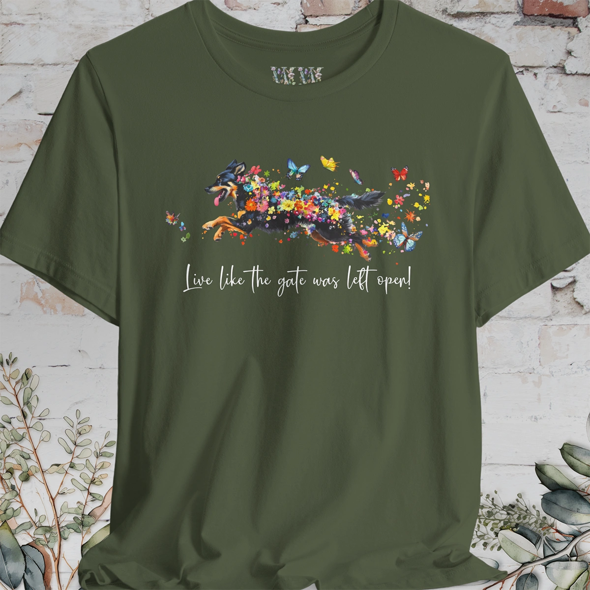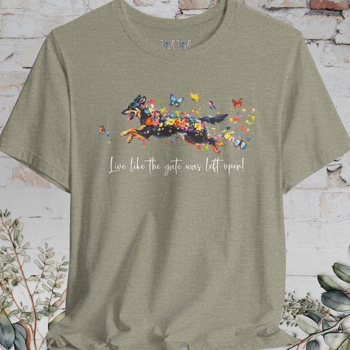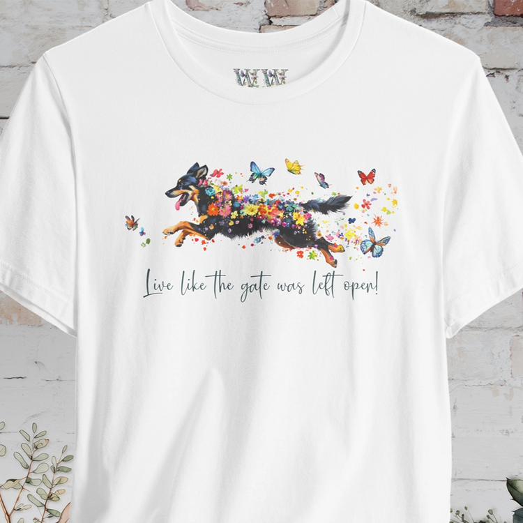 🦋 Celebrate the boundless joy of your furry friend with this vibrant Husky T-shirt! 🌈 Featuring a colorful Husky surrounded by butterflies and the inspiring words, "Live like the gate was left open!", this unisex tee is perfect for dog lovers who cherish the adventurous spirit of their pups. 🐾