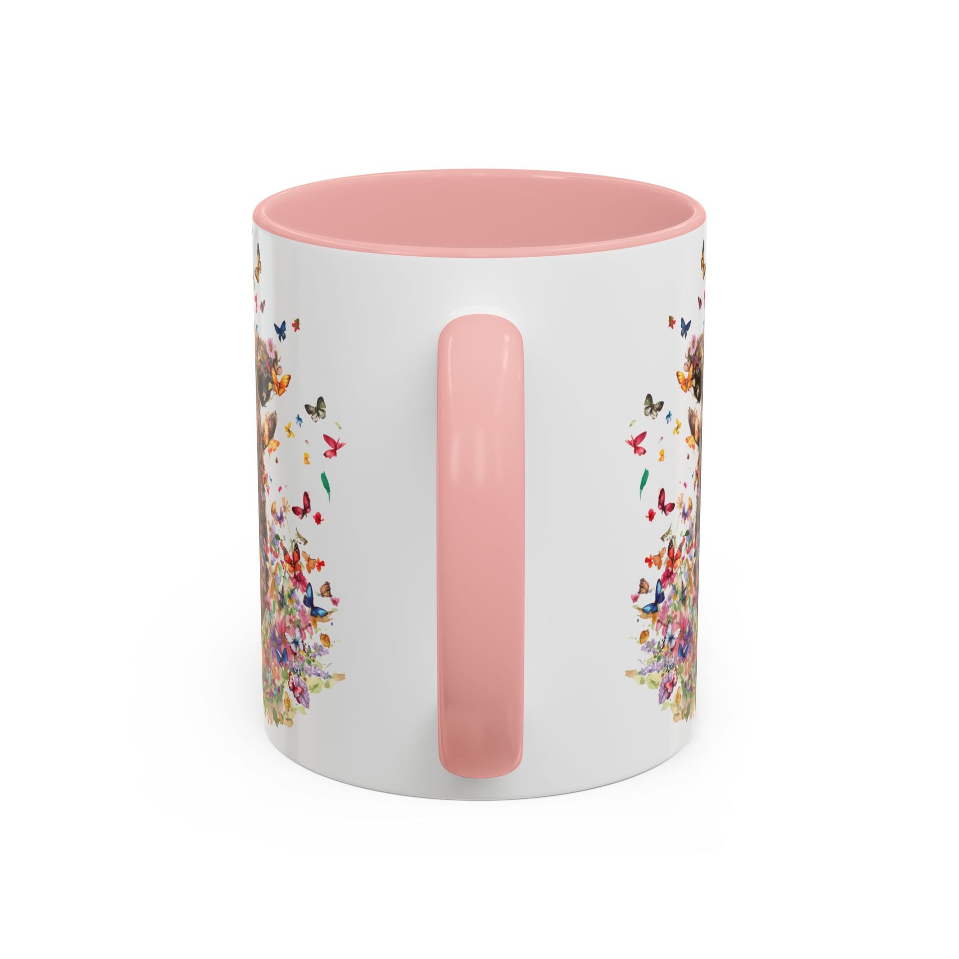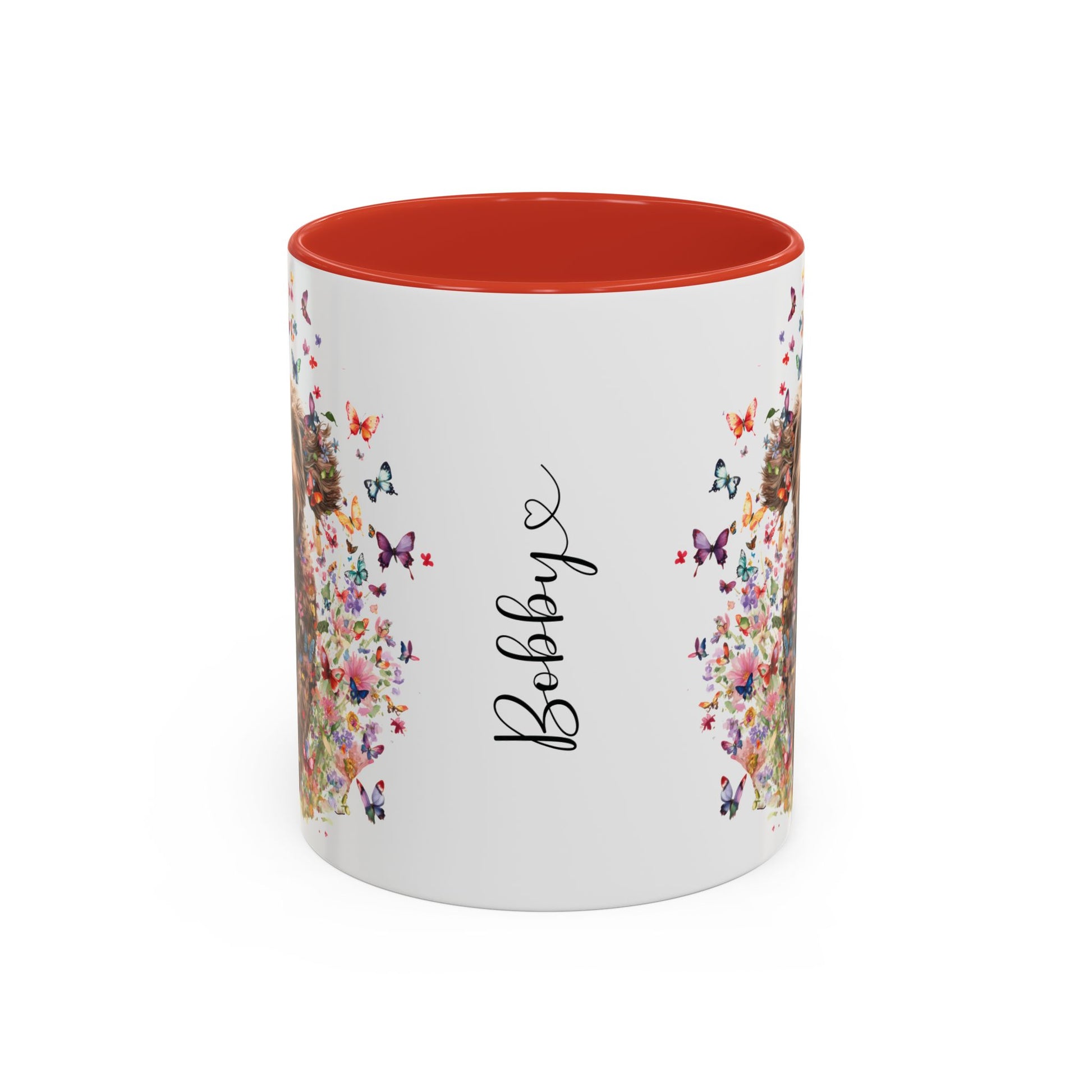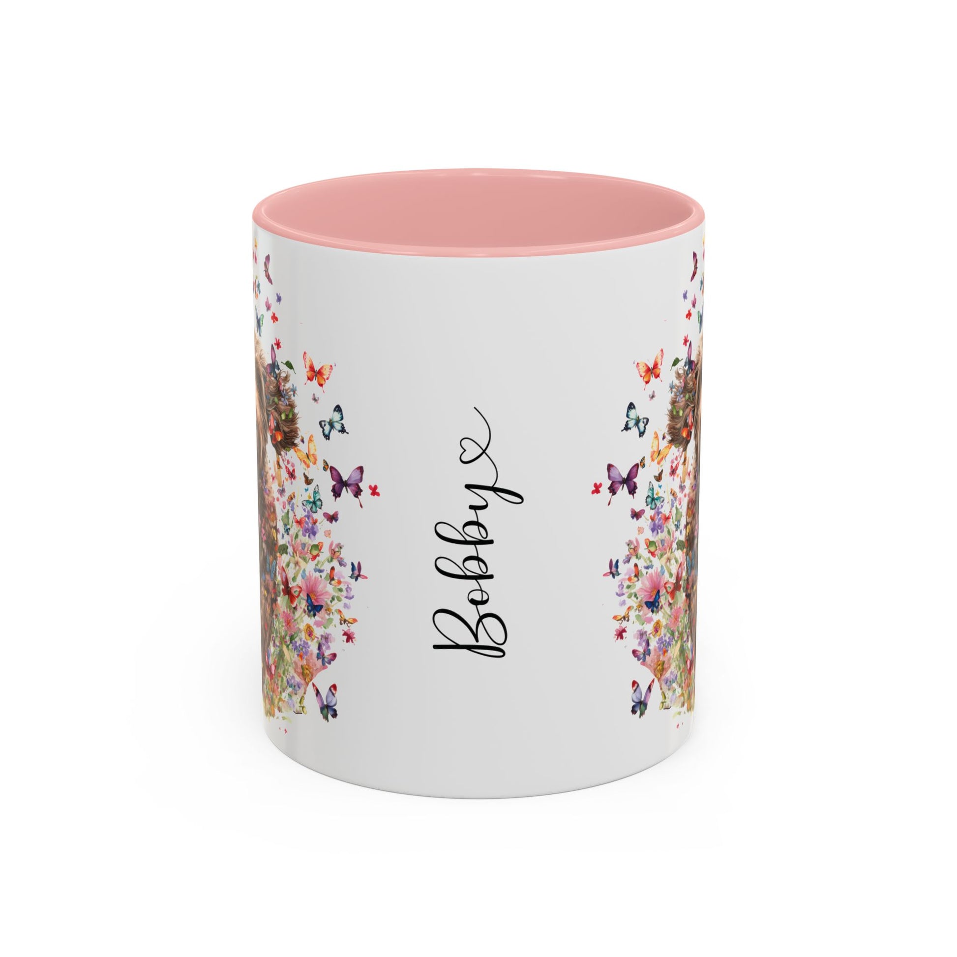 Personalised Chocolate Labradoodle butterfly ceramic coffee mug, 11oz. Customise with either your name or your Labradoodle's name.