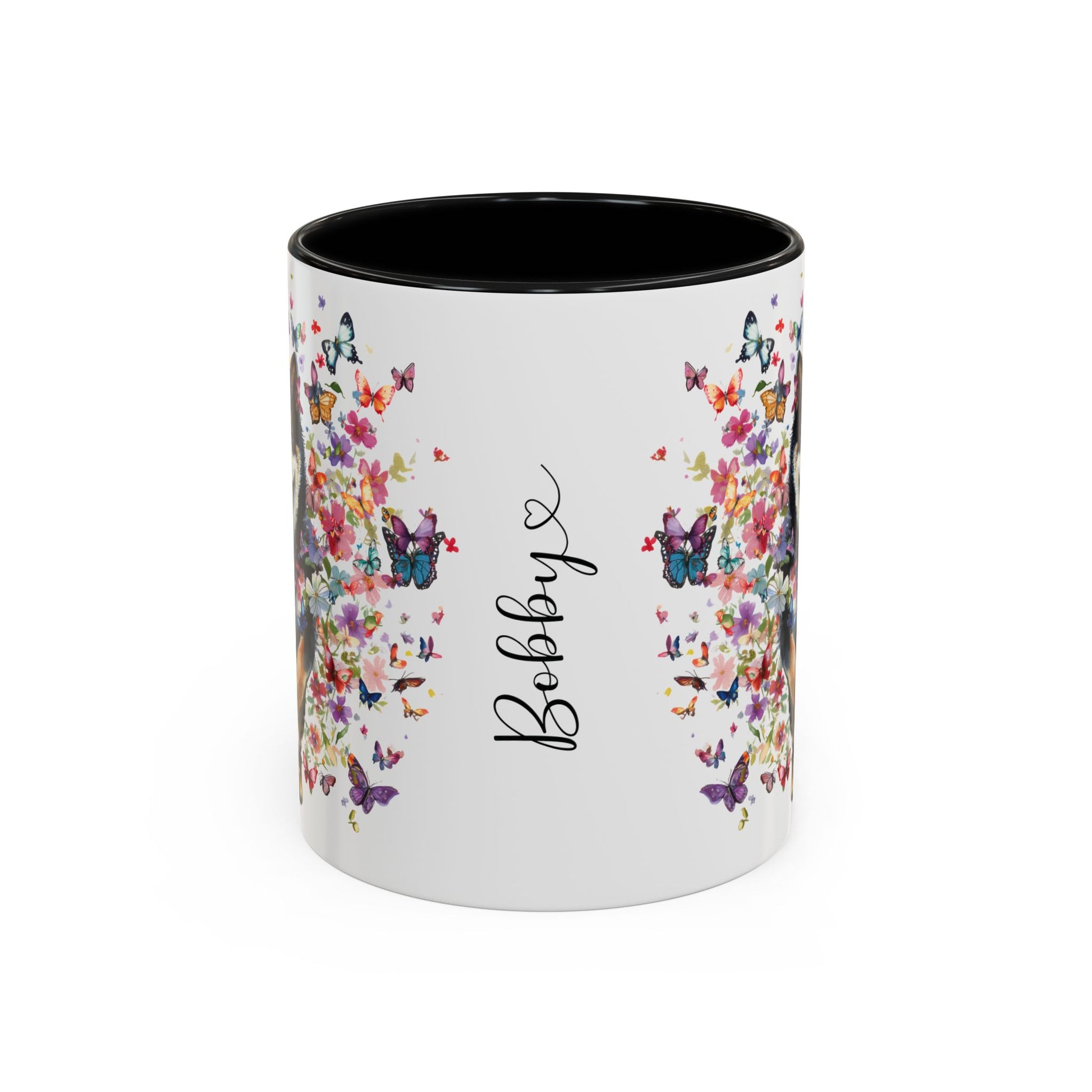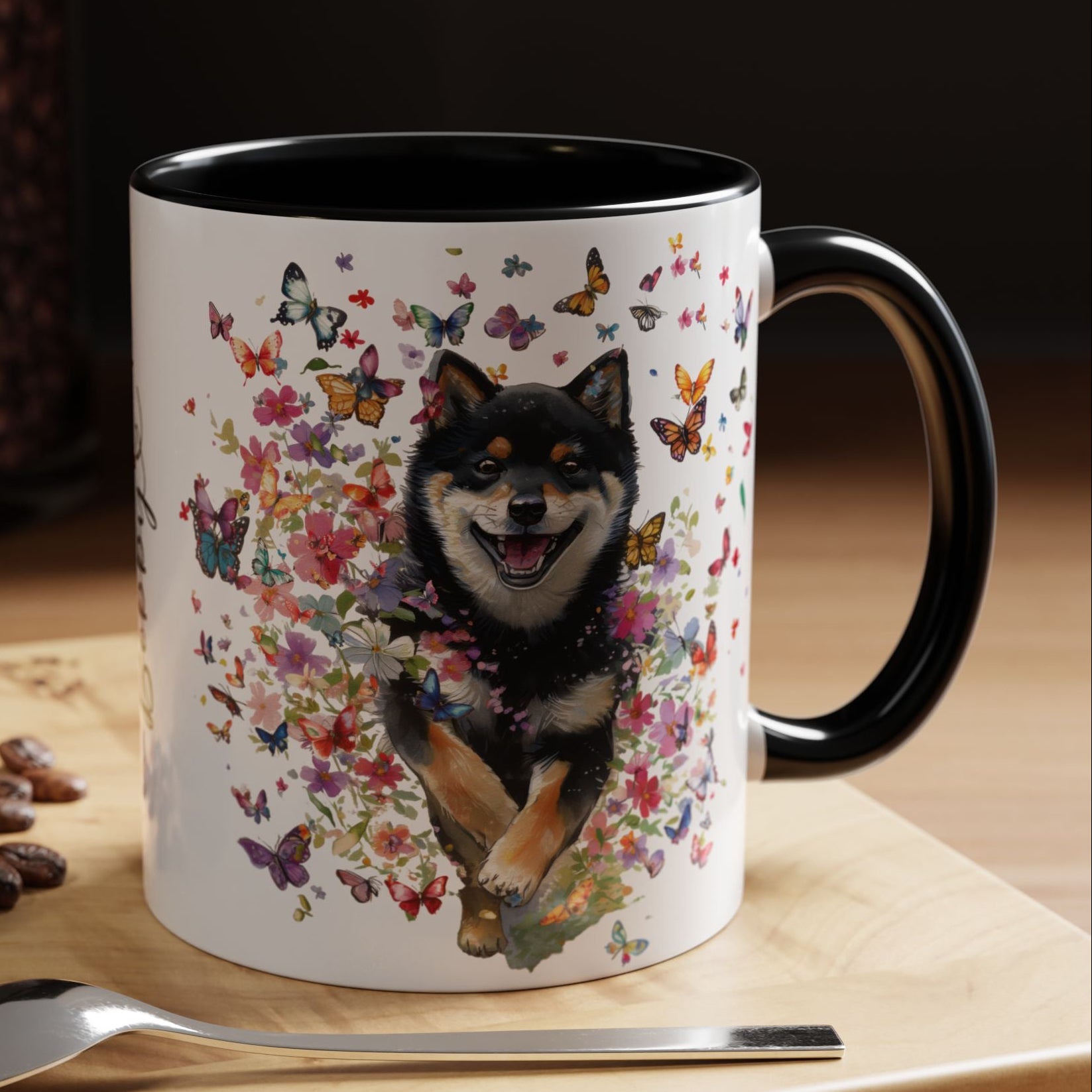 Personalised Black Shiba Inu butterfly ceramic coffee mug, 11oz. Customise with either your name or your Shiba Inu's name.