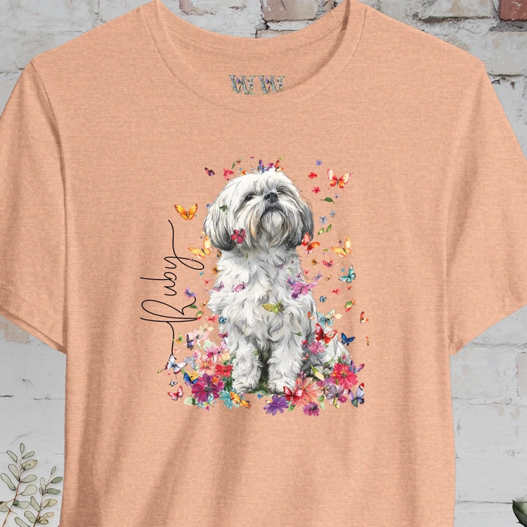 🦋 Celebrate your love for your Shih Tzu with our Personalized Shih Tzu T-shirt, featuring a colorful floral design. This custom gift is perfect for any Shih Tzu lover or owner, offering a floral custom shirt that's as unique as their bond with their furry friend. Add your fur baby's name for that special touch, or give as a perfect gift to a loved one.