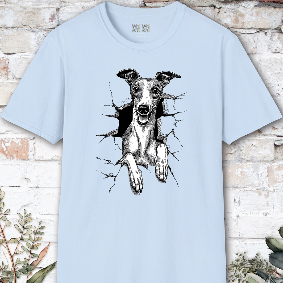 Featuring a striking sketch-style illustration of a Whippet bursting through the design, this tee captures energy, personality, and fun in a clean black-and-white look.