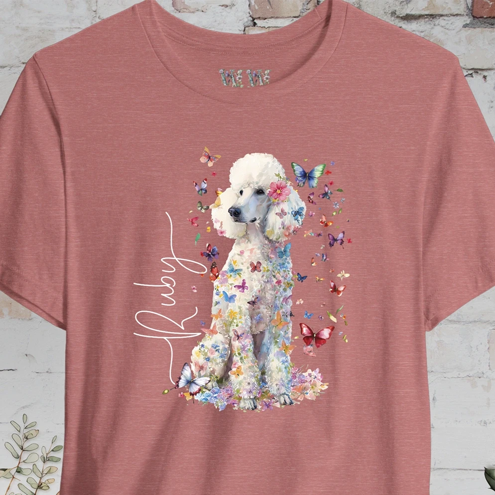 🦋 Celebrate your love for your Poodle with our Personalized Poodle T-shirt, featuring a colorful floral design. This custom gift is perfect for any Poodle lover or owner, offering a floral custom shirt that's as unique as their bond with their furry friend. Add your fur baby's name for that special touch, or give as a perfect gift to a loved one.
