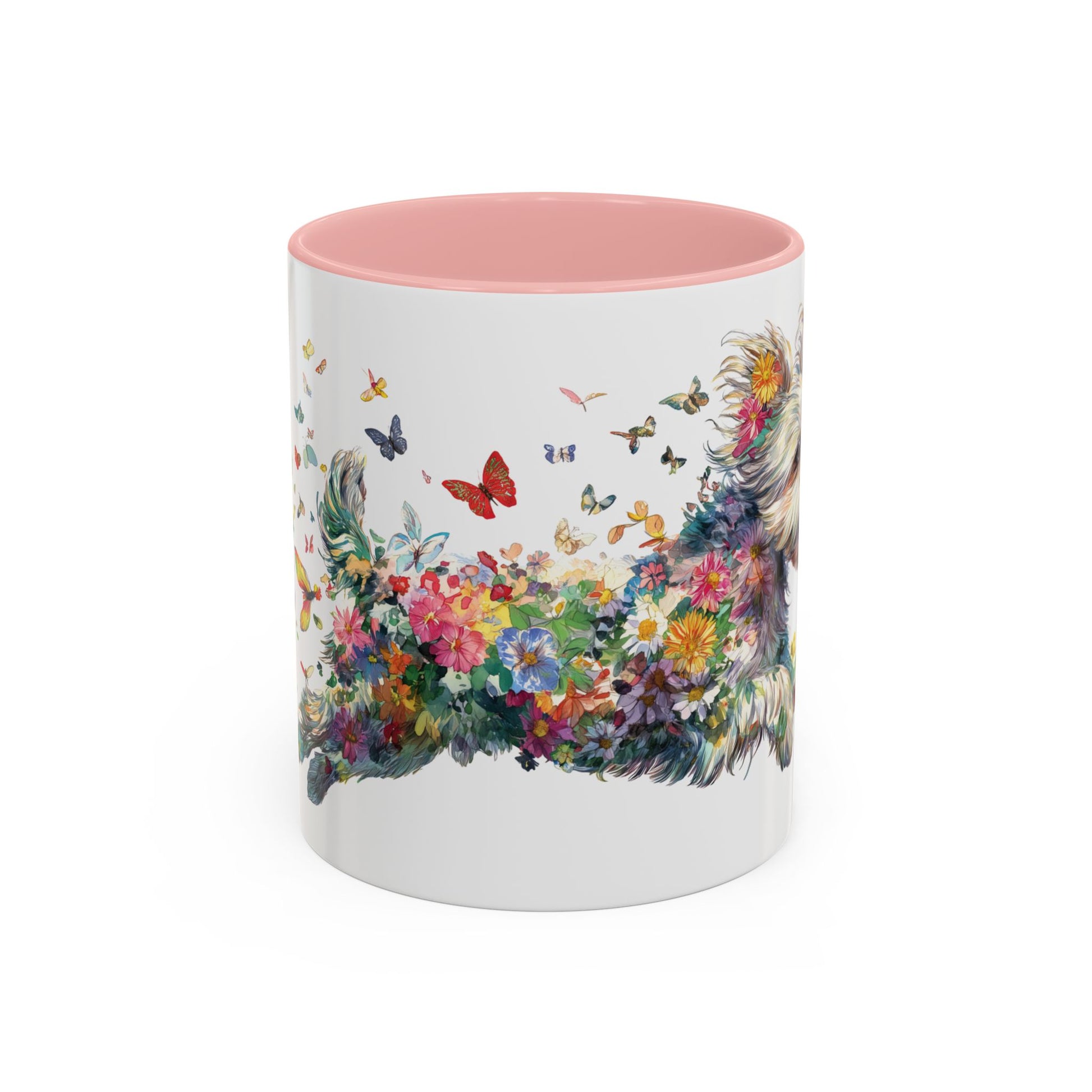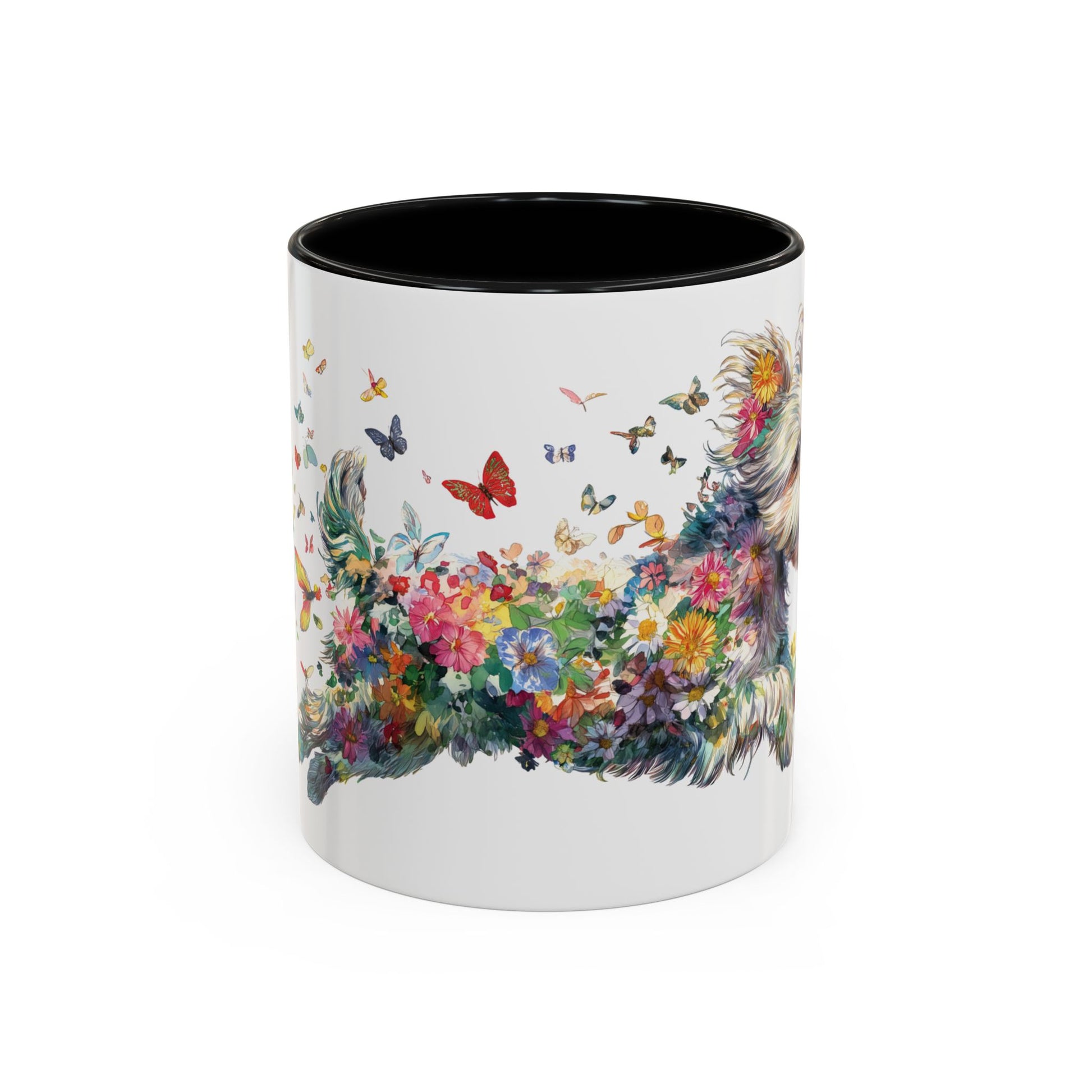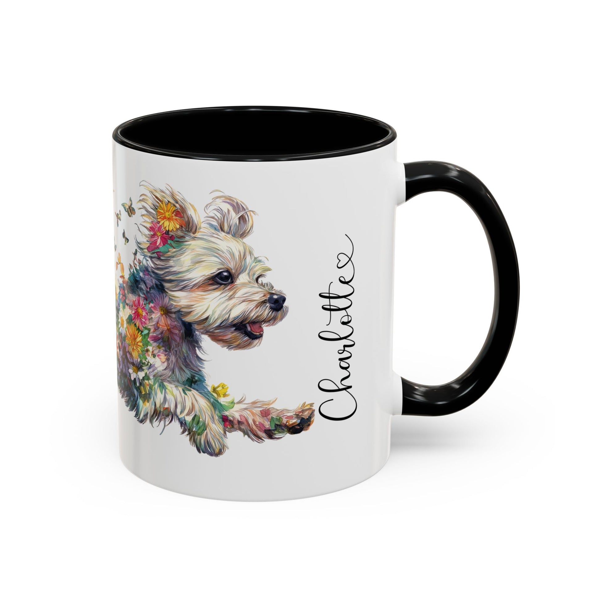 Personalised Yorkipoo butterfly ceramic coffee mug, 11oz. Customise with either your name or your Yorkipoo's name.